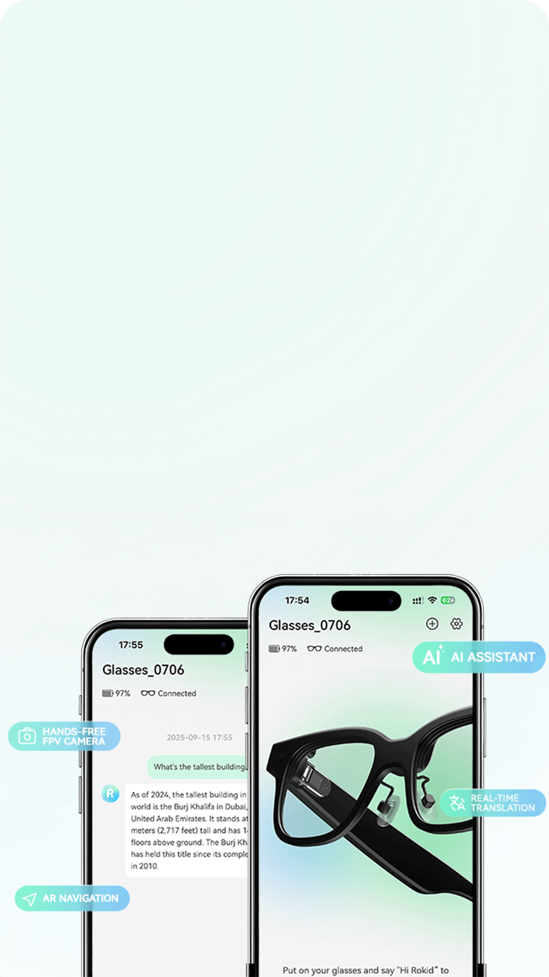 After downloading the Hi Rokid app, you can connect the Rokid Glasses with your mobile device to enter a brand-new AI world. With multiple innovative interaction methods and seamless compatibility with various terminals, it brings you an entirely new experience.